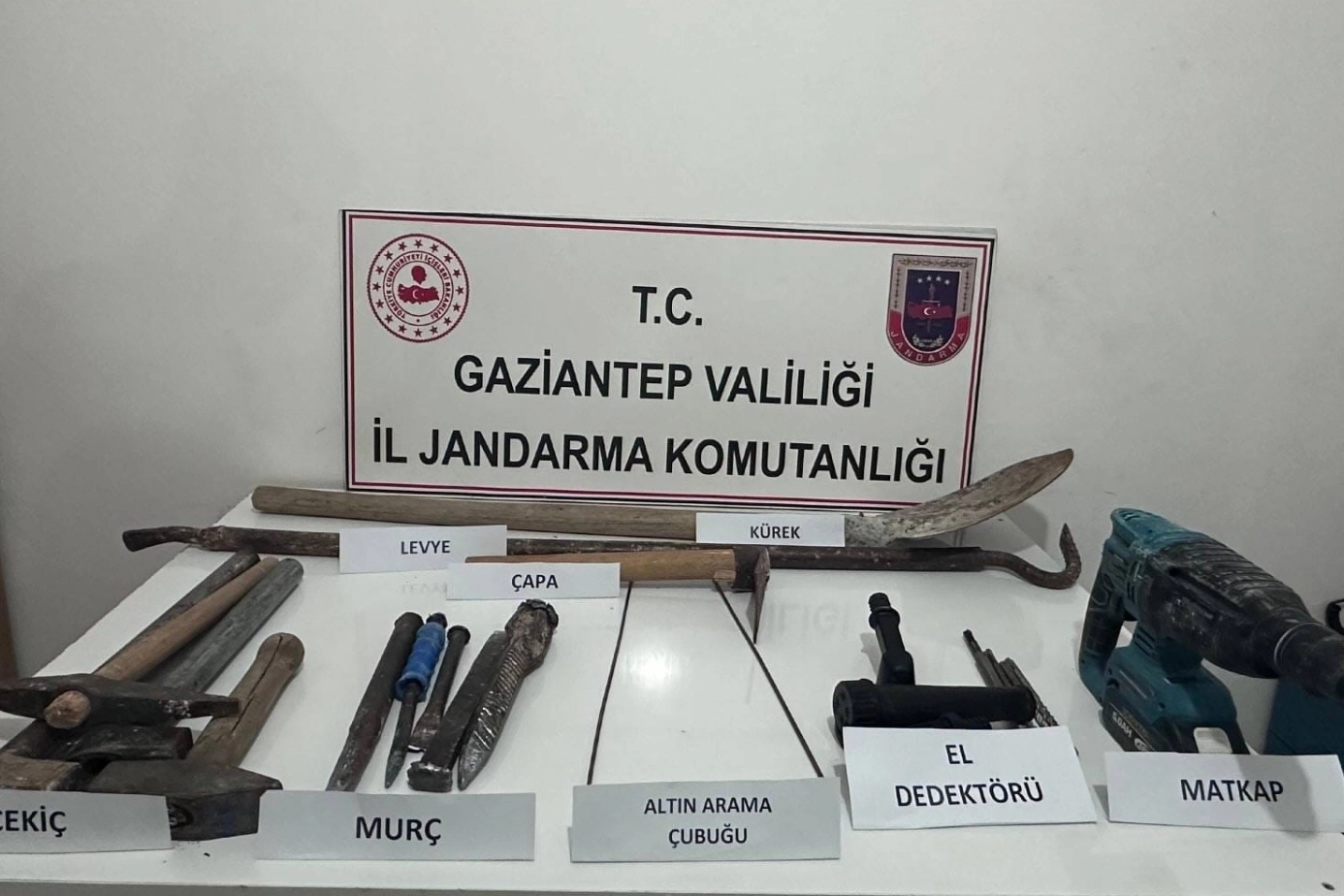 Şahısların üzerinde yapılan aramalarda ise 1 adet el dedektörü, 1 adet darbeli matkap, 15 adet çeşitli kazı malzemesi ve 2 adet altın arama çubuğu ele geçirildi.