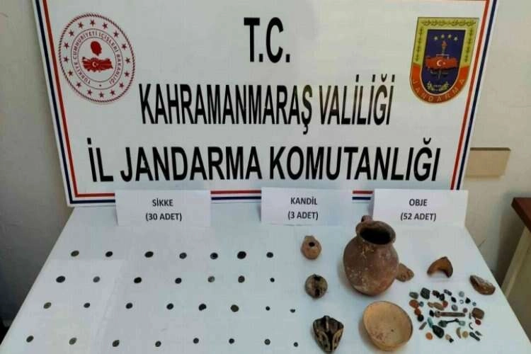 İl Jandarma Komutanlığı İstihbarat Şube Müdürlüğü ekipleri, aldıkları duyum üzerine Türkoğlu ilçesi, Ceceli Mahallesi yol kontrol noktasında bir aracı durdurarak arama yaptı. Aramada, 30 adet Roma dönemine ait olduğu değerlendirilen sikke, 3 adet kandil, 52 adet obje olmak üzere toplam 85 adet tarihi eser niteliğindeki obje ele geçirildi. Olayla ilgili M.Ç. (52) hakkında adli işlem başlatıldı.