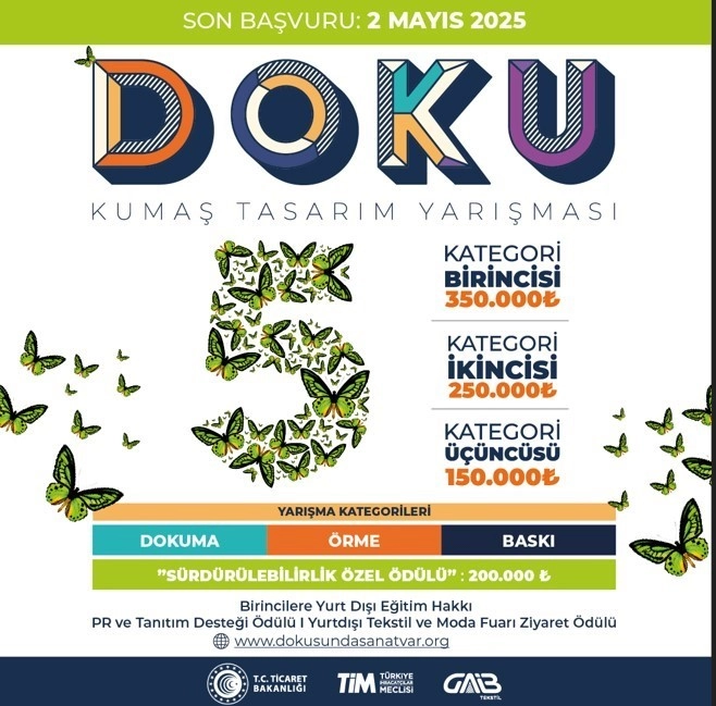 Güneydoğu Anadolu Tekstil ve Hammaddeleri İhracatçıları Birliği (GATHİB) tarafından, Türkiye İhracatçılar Meclisi koordinasyonu ve T.C. Ticaret Bakanlığı desteğiyle sürdürülebilir ve katma değerli tekstil ihracatına katlı sağlamak amacıyla bu yıl beşincisi düzenlenen Doku Kumaş Tasarım Yarışması’na başvurular başladı. ‘’Dokuma, örme ve baskı” şeklinde 3 ayrı kategoride genç tasarımcıları sektöre kazandırmak amacıyla düzenlenecek yarışmada toplam 2,45 milyon TL para ödülü verilecek.