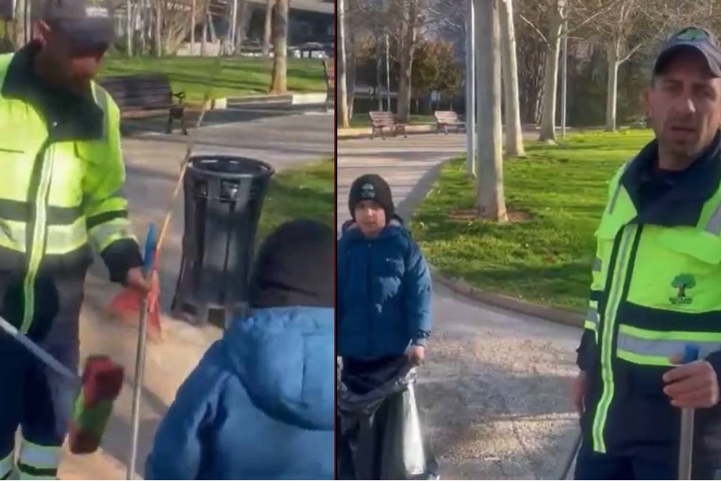 Edinilen bilgilere göre, sabah saatlerinde görevine çıkan temizlik işçisi, küçük yaştaki oğlunu da yanına alarak sokak temizliği yaptı.
