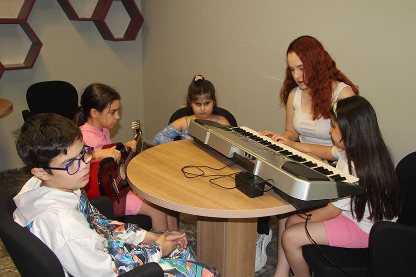 Engelsiz Eğitim ve Kariyer Merkezi'nde yaz kursuna katılan görme engelli öğrencilere müzik eğitimi verdiğini belirten Simay Boz, "Kursumuz görme engelli öğrenciler için yaz döneminde açılması planlanan kurs olarak hizmet veriyor. Öğrencilerime piyano, org, gitar ve diğer müzik enstrümanları eğitimleri veriyorum. Öğrencilerimin hepsi görme engelli ve bu yüzden görme engellilere yönelik enstrüman eğitimi veriyorum. Görme engellilere yönelik braille nota sistemi ile enstrüman çalmayı ve şarkı söylemeyi öğretiyorum" dedi.