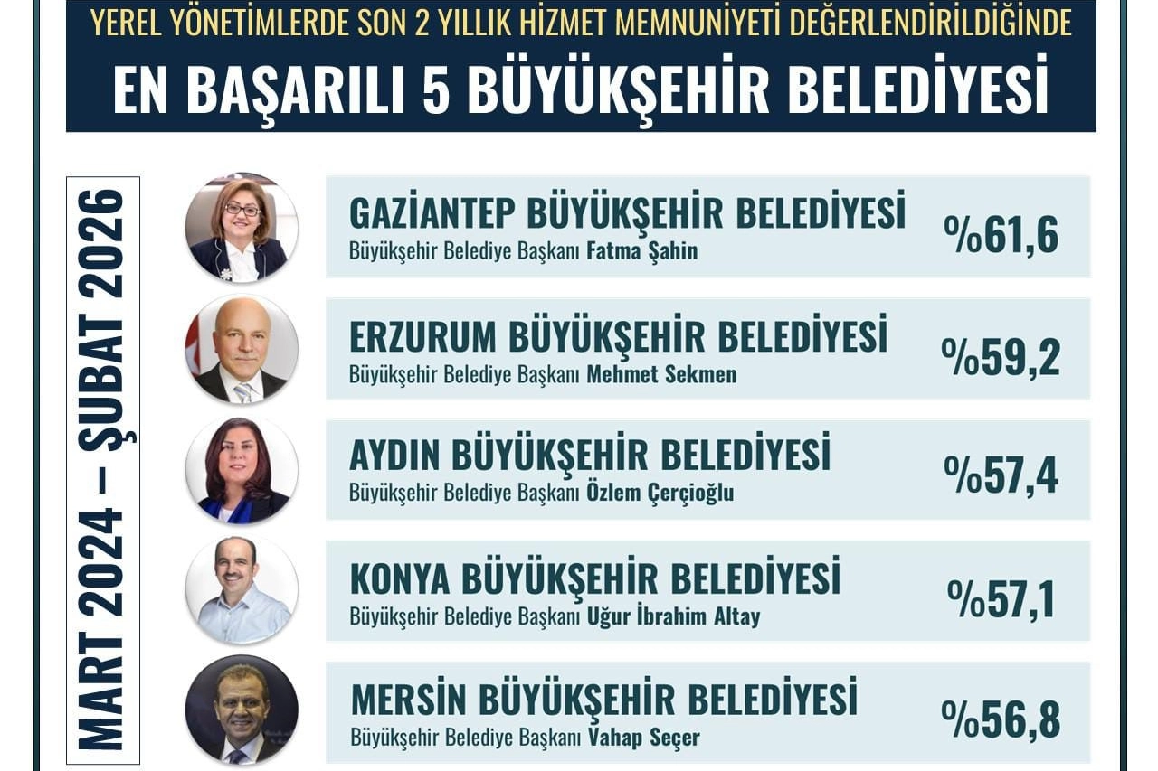 Bir araştırma şirketi, Türkiye genelinde 25 büyükşehir belediyesine yönelik Mart 2024-Şubat 2026 tarihleri arasındaki ’2 Yıllık Hizmet Memnuniyeti Değerlendirmesi’ anketi yaptı. 15-19 Şubat 2026 tarihleri arasında 9 bin 230 katılımcıyla yapılan anket sonucunda Gaziantep Belediye Başkanı Fatma Şahin yüzde 61,6’lım memnuniyet oranı ile birinci oldu.